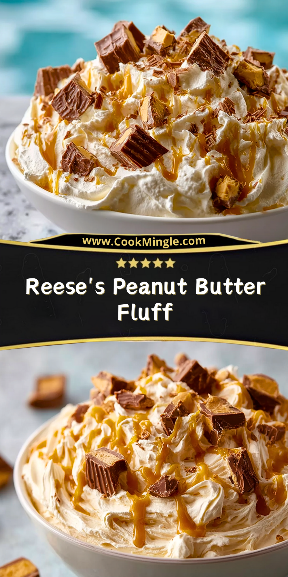 Chop the mini Reese’s Peanut Butter Cups into halves or quarters, depending on your preference. Fold them gently into the fluff. Save a handful for topping.
