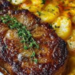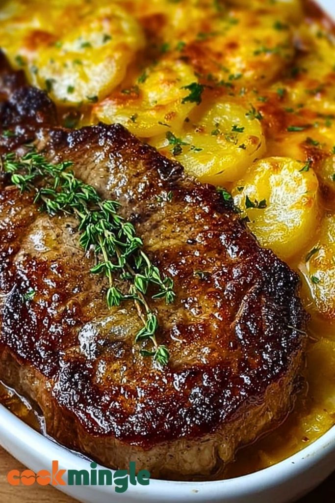 Juicy, perfectly seared ribeye paired with ultra-creamy, cheesy scalloped potatoes—this dish brings steakhouse luxury right into your kitchen. The steak is cooked to a sizzling crust on the outside, tender and flavorful on the inside, while the potatoes are baked in a luscious cheese sauce that melts into golden, bubbling perfection. Every bite is a comforting, hearty combination of melt-in-your-mouth beef and velvety potatoes laced with sharp cheddar and a hint of garlic.