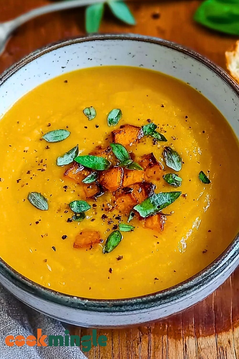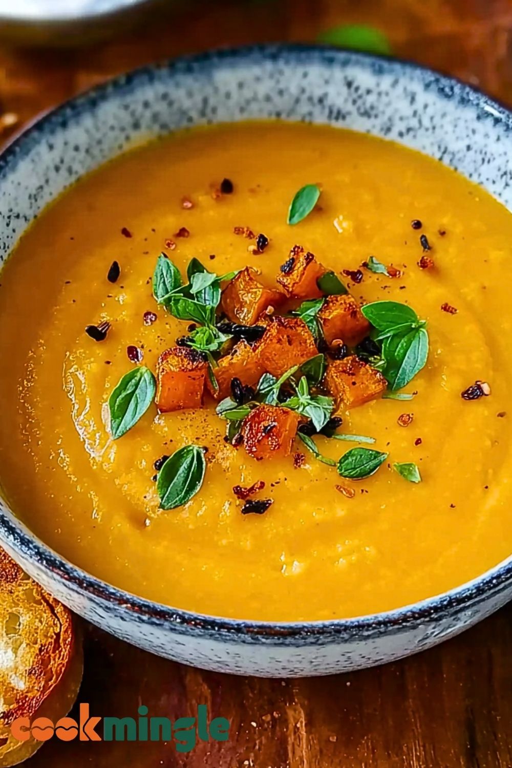 9. Serve hot with garnishes like basil, extra roasted cubes, or a drizzle of olive oil.