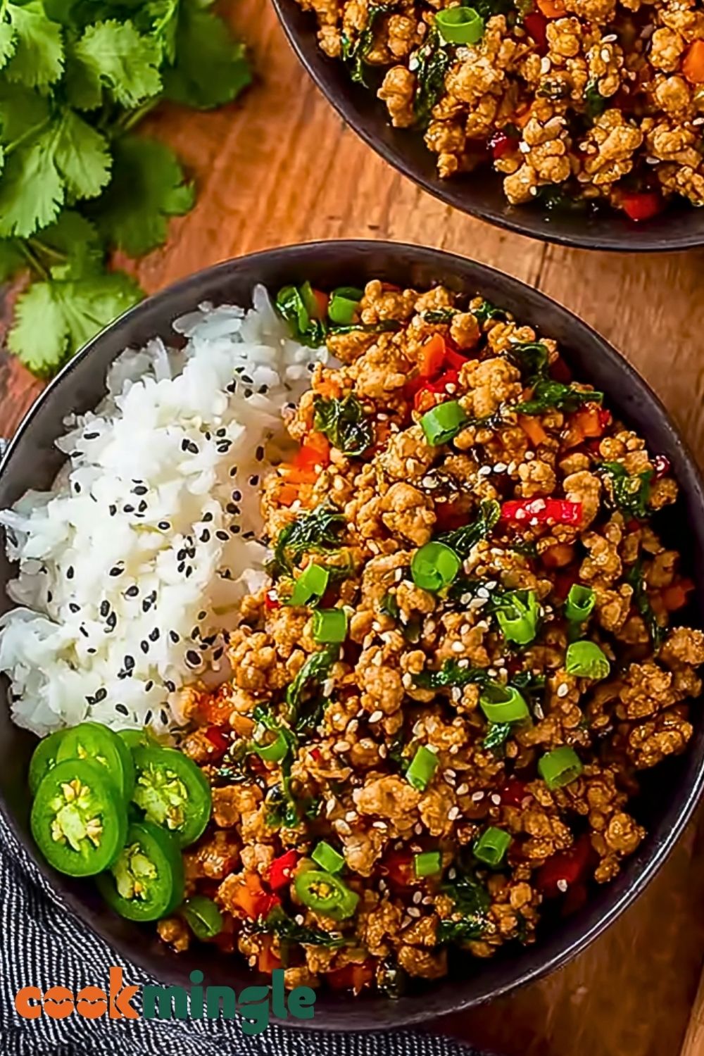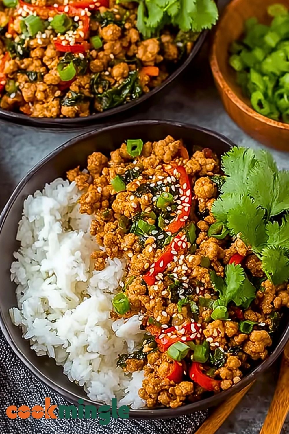 Spoon cooked rice into bowls, top with the savory ground turkey mixture, and garnish with sliced green onions, sesame seeds, and fresh cilantro. Serve immediately while hot.