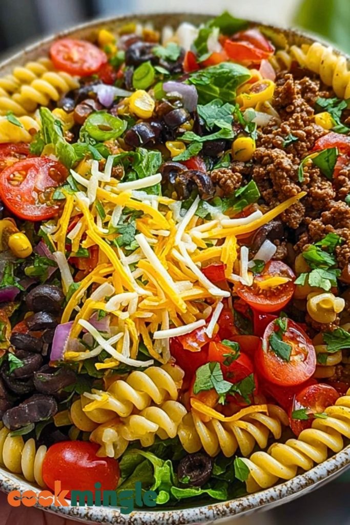 What makes this dish so special is the fusion of taco night favorites with the ease of a pasta salad. Ground beef spiced like taco filling, mixed with rotini pasta, black olives, cherry tomatoes, corn, red onions, shredded cheese, and a cilantro-lime kick—this bowl is everything I love in one meal. It’s filling without being heavy, and customizable enough that you can tweak it for any craving or dietary need.