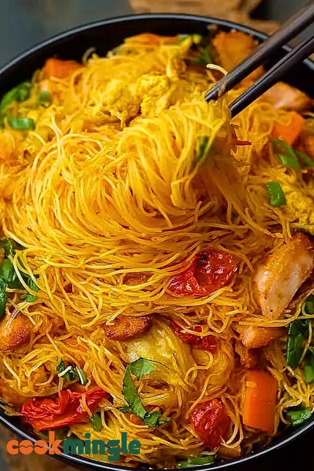 Singapore Noodles are incredibly versatile—you can make them vegetarian, swap out proteins, or adjust spice levels to taste. The curry powder is the flavor foundation, so choose one with a rich aroma and a bit of heat. Pre-cooked proteins like rotisserie chicken or leftover roast pork are great time savers. If you’re meal-prepping, store the noodles separately from any garnishes to keep them fresh.