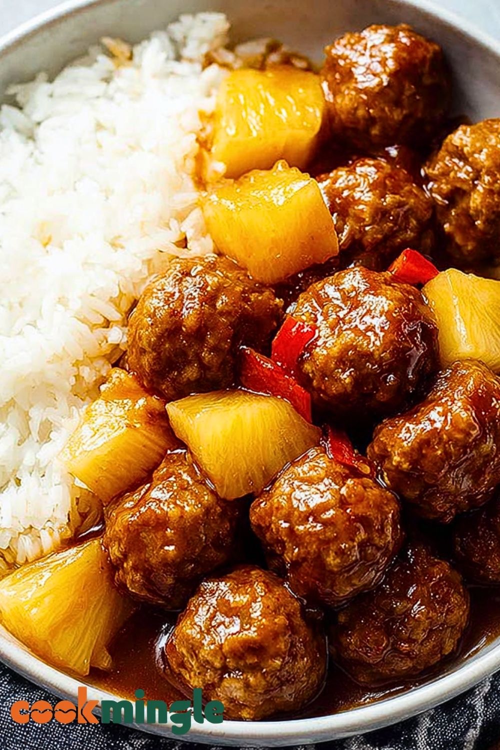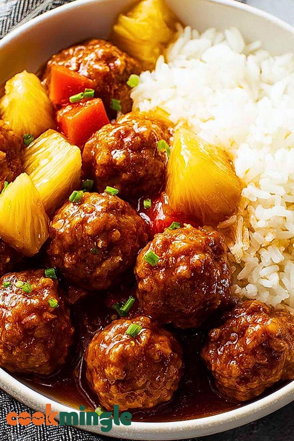 Spoon the meatballs and sauce over a bed of freshly cooked white rice. Make sure to get some pineapple chunks in every serving for that sweet burst of flavor.