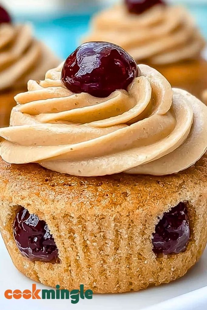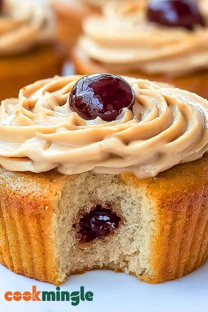 Pipe or spread the peanut butter frosting on top of the cooled cupcakes. Optionally, add a small dollop of jam or a whole cherry on top for flair and flavor contrast.
