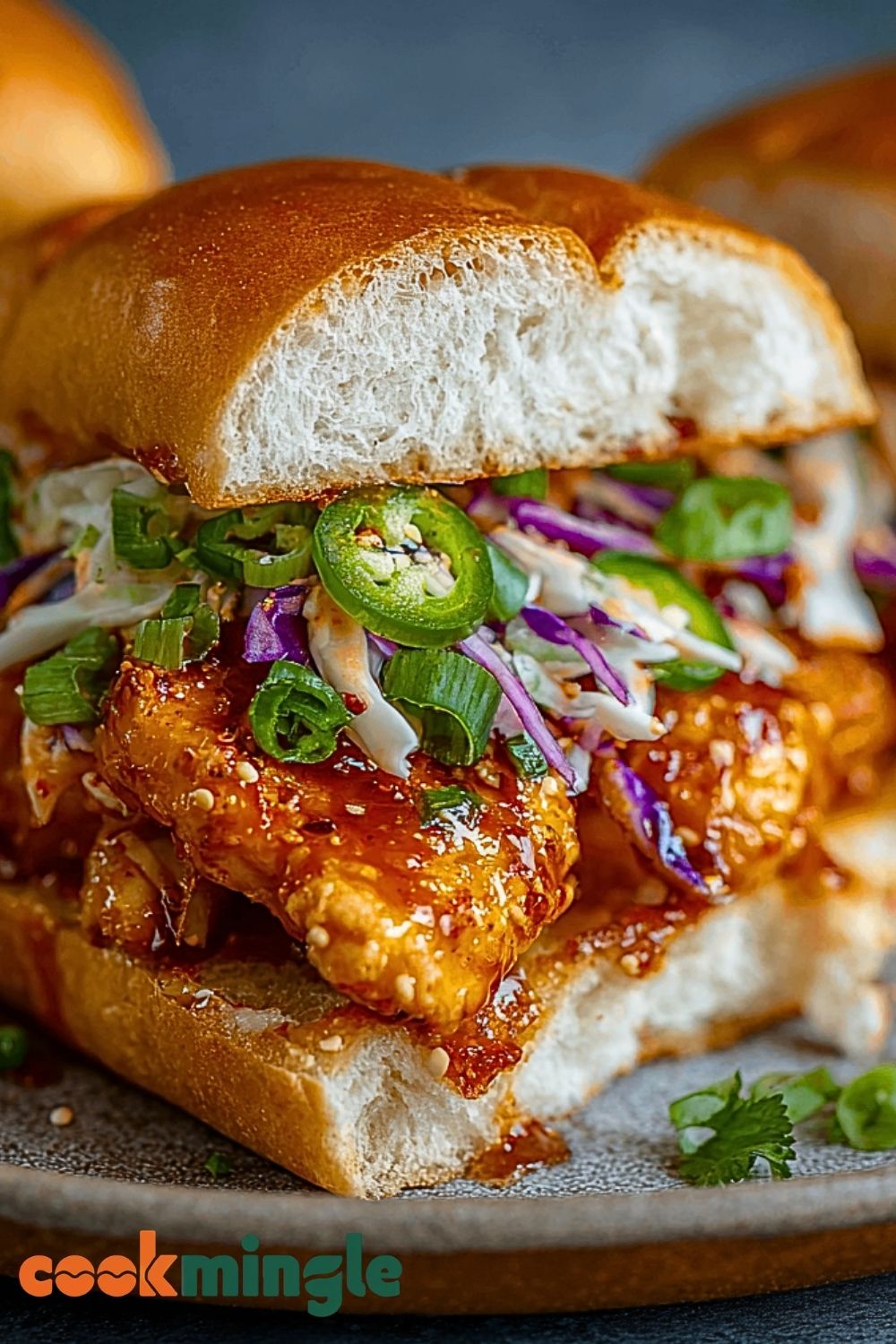 9. Spread bang bang sauce on bottom bun. Add chicken, slaw, cilantro, and green onions. Top with more sauce and the bun. Serve hot.