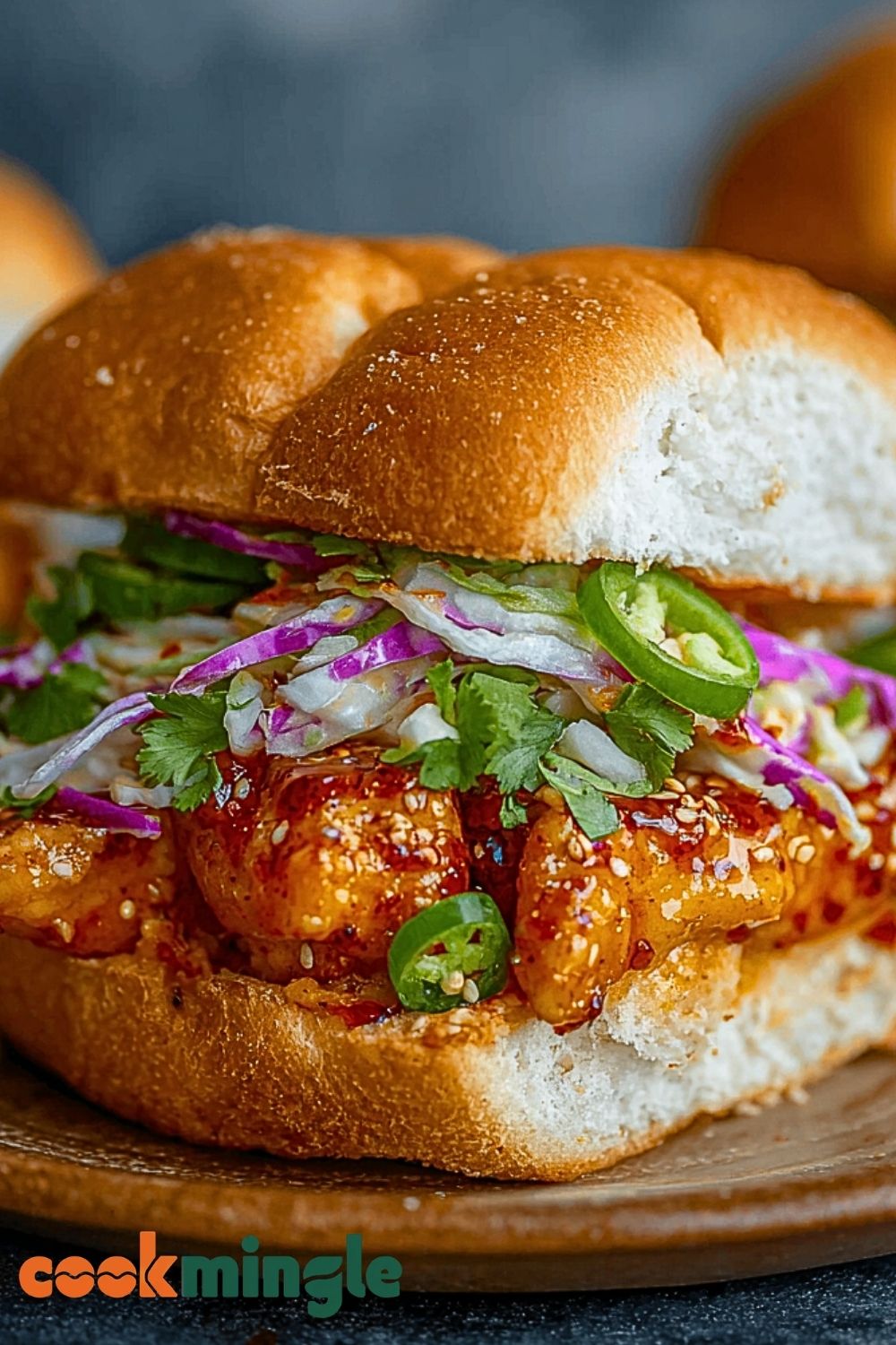 Leftover fried chicken can be stored in an airtight container in the refrigerator for up to 3 days. To reheat, bake in a preheated oven at 375°F (190°C) for 10–15 minutes to restore crispiness. Store slaw separately to keep it fresh. Assemble the sandwich only when ready to eat. Bang bang sauce can be refrigerated in a sealed jar for up to a week.
