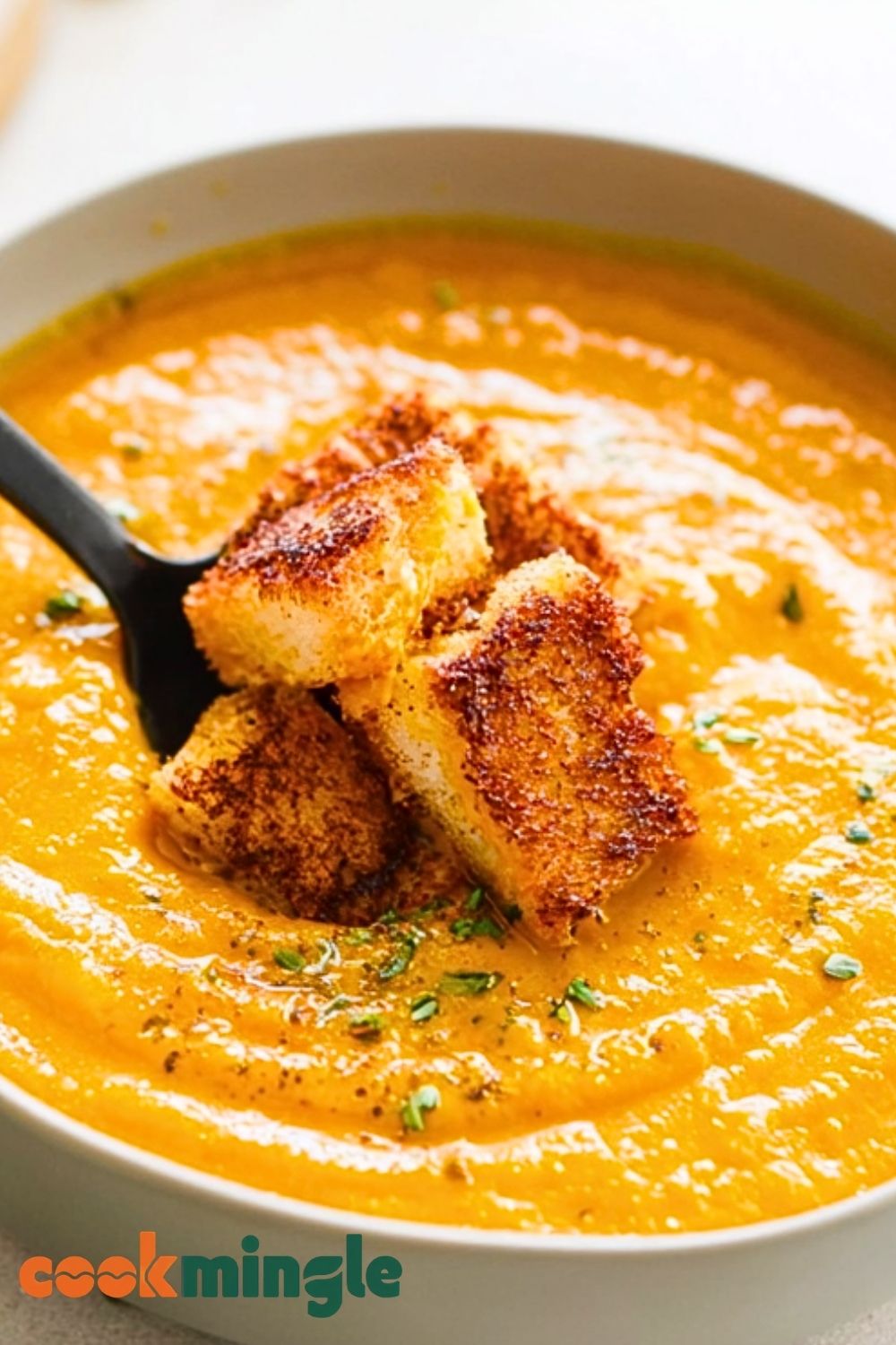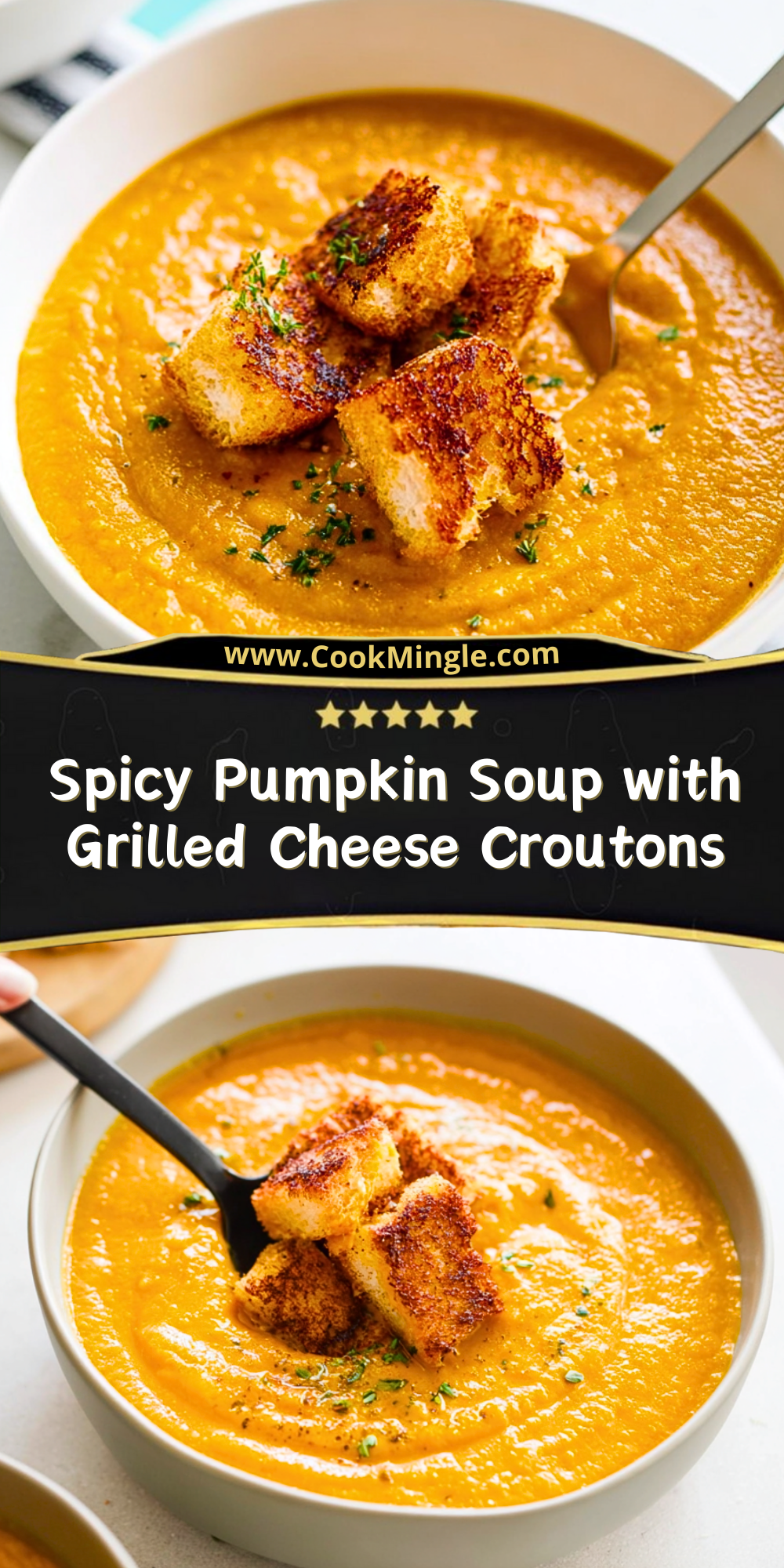 Spicy Pumpkin Soup with Grilled Cheese Croutons