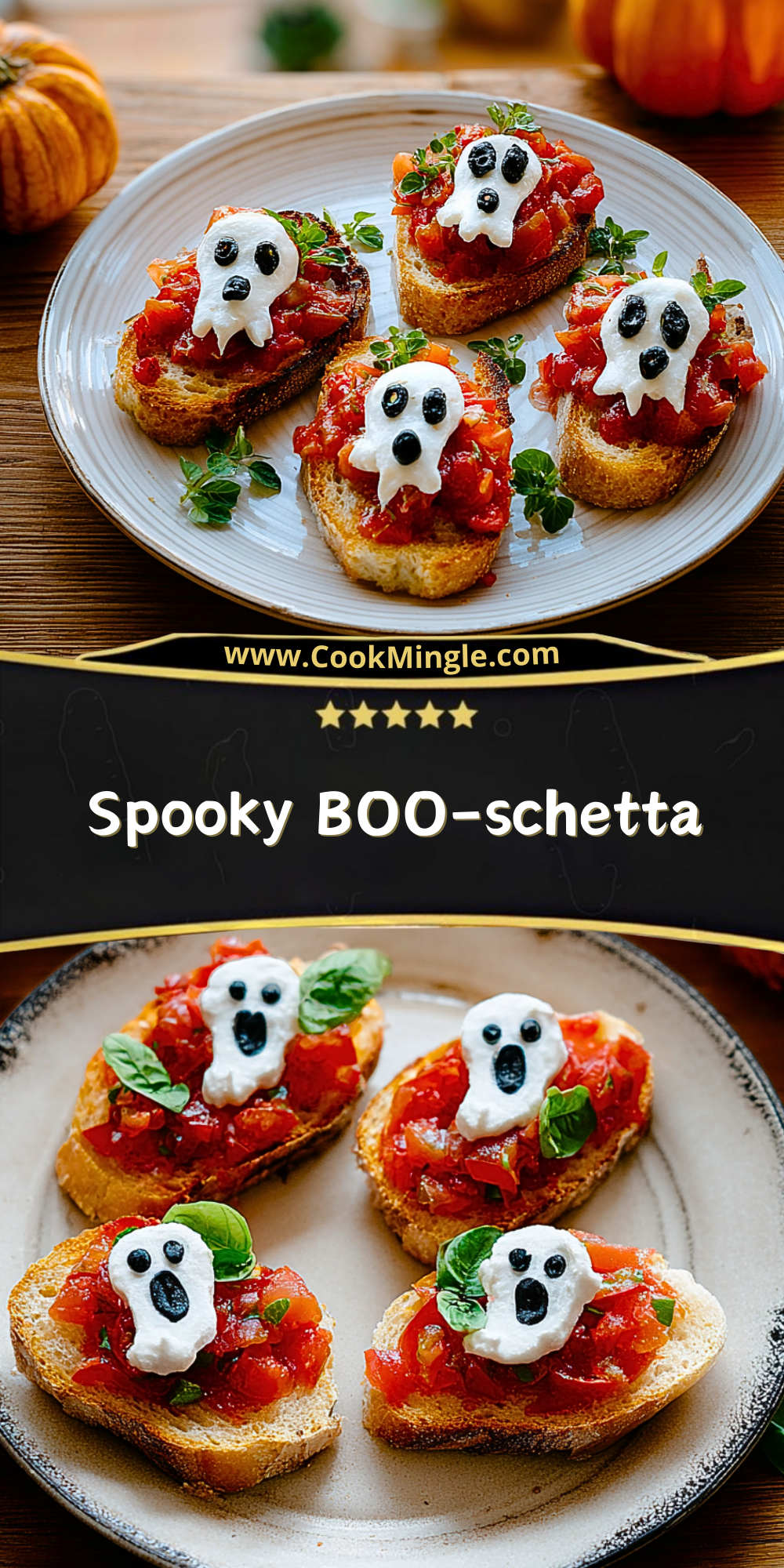 Each slice of toasted baguette is topped with juicy cherry tomatoes tossed in garlic, olive oil, and herbs, then crowned with a ghost made from creamy cheese and dotted with olive “eyes.” The result? A deliciously eerie appetizer that’s as tasty as it is Instagram-worthy.