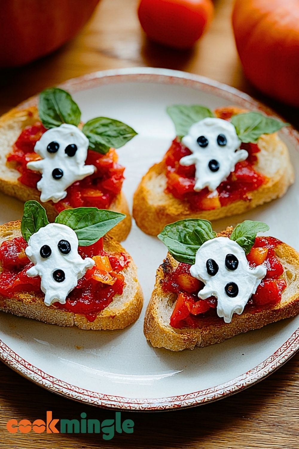 5. Top each toasted baguette slice with tomato mixture, then place a cheese ghost on top. Add olive eyes and garnish with fresh basil or drizzle of balsamic glaze if desired.