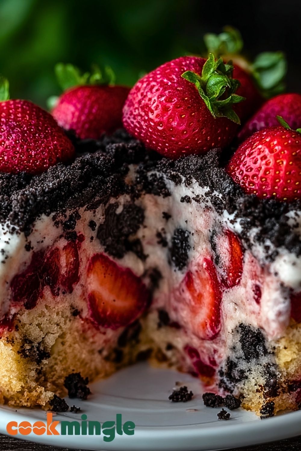 Slice the cake horizontally to create two layers. Place the bottom layer on a serving plate. Spread a layer of whipped cream over it, then add half the strawberries and a generous sprinkle of Oreo crumble. Repeat with the second layer of cake, more whipped cream, and the rest of the strawberries. Finish by covering the top with cream and pressing Oreo crumbles onto the top and sides.