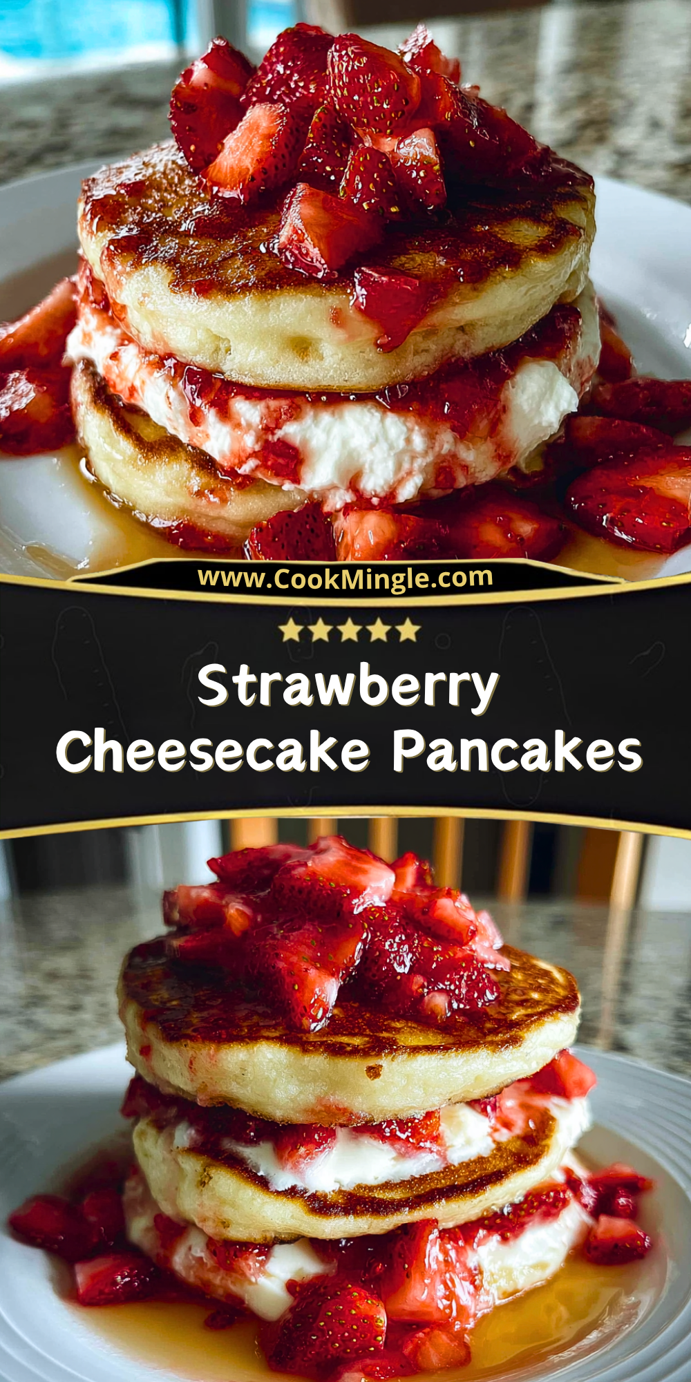 Fluffy, golden pancakes stacked high and layered with a luscious cheesecake filling—this dish turns a simple breakfast into a decadent experience. Juicy strawberries glisten on top, their natural sweetness enhanced by a light syrup that seeps into every bite. Each forkful balances creamy, tangy, and sweet flavors in a way that feels both indulgent and comforting.