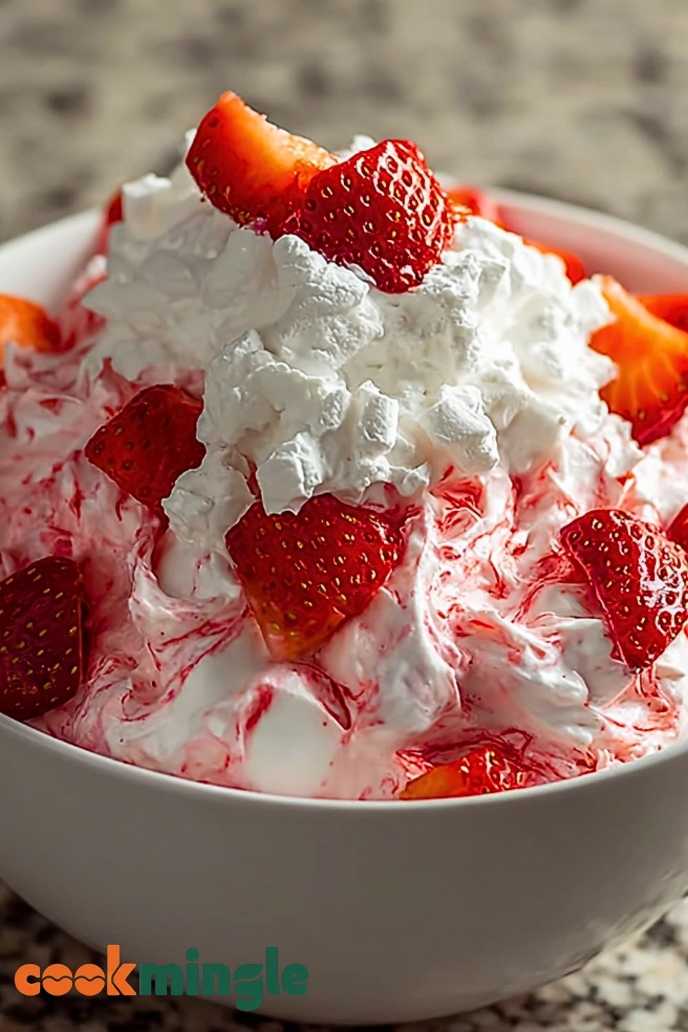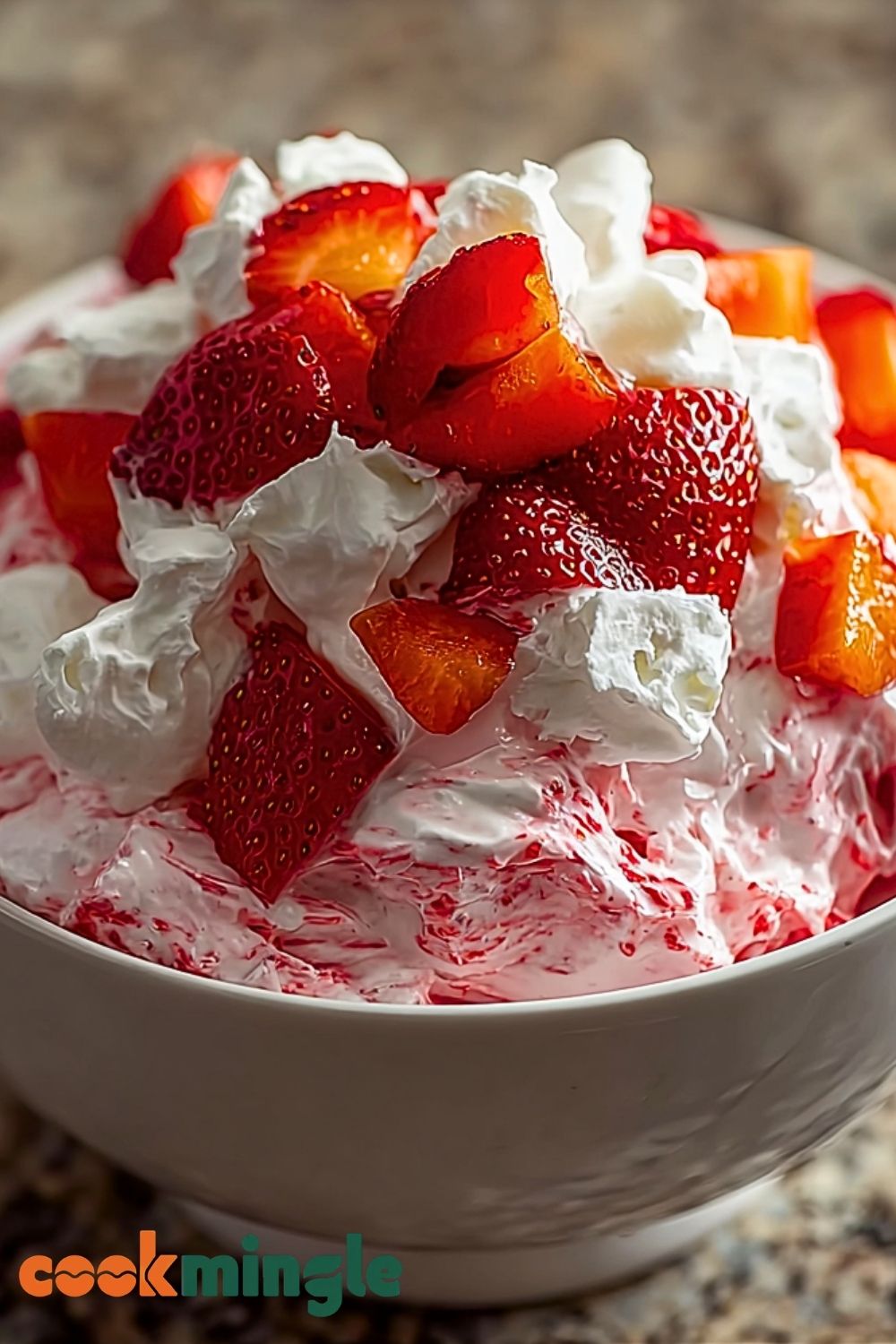 5. Add marshmallows, strawberries, and drained pineapple, folding gently to combine.
