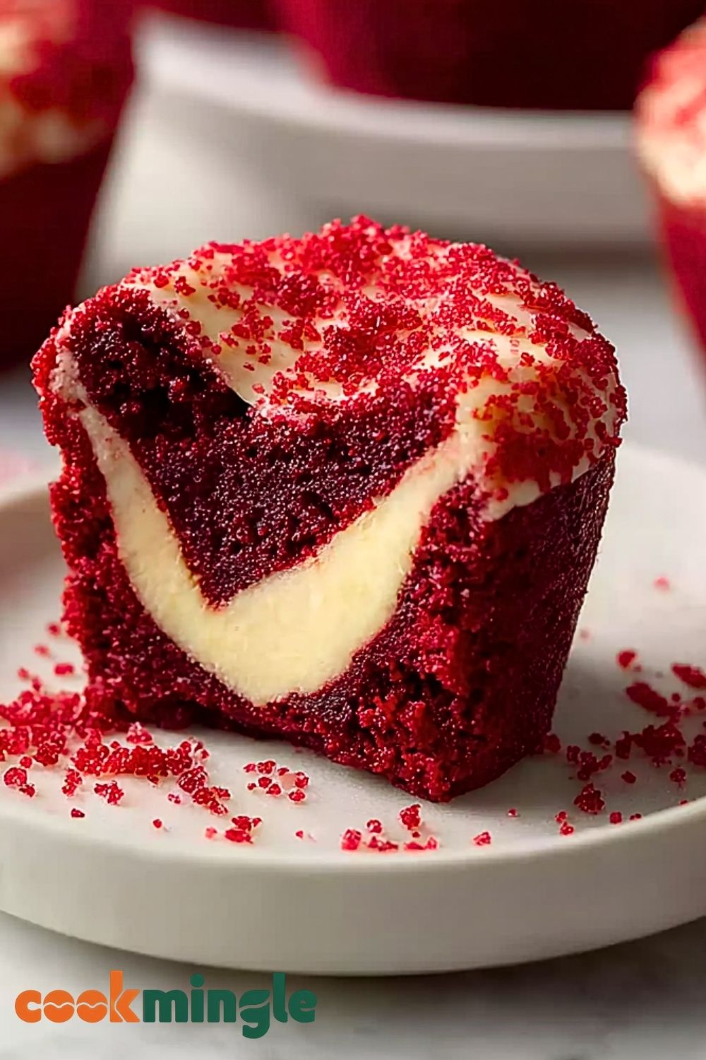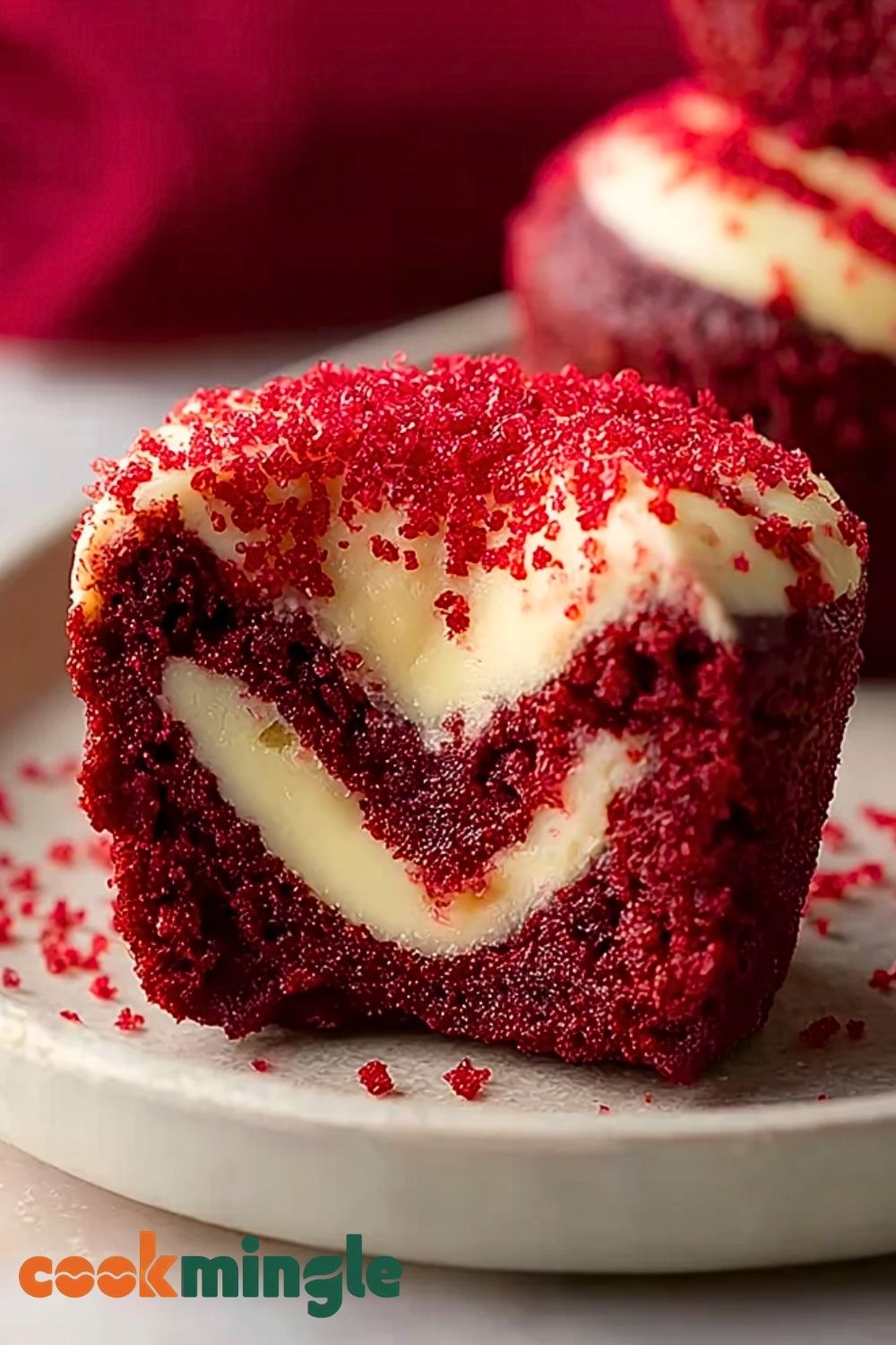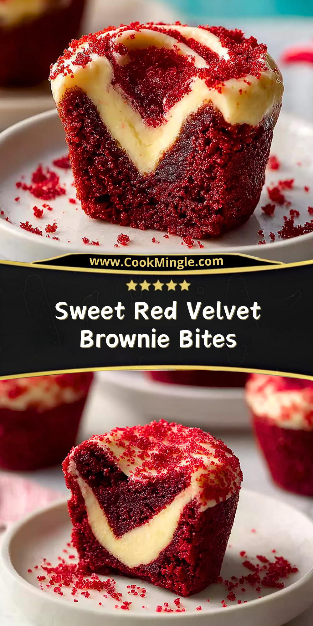 Spoon about 1 tablespoon of red velvet brownie batter into each mini muffin cup. Add about 1 teaspoon of cream cheese filling on top of that. Swirl slightly with a toothpick or skewer to create a marbled effect. You can top with a pinch of red velvet crumbs if desired.