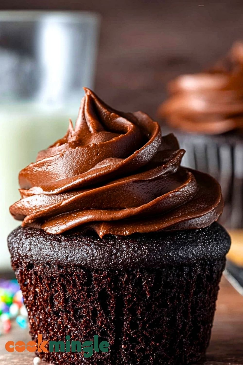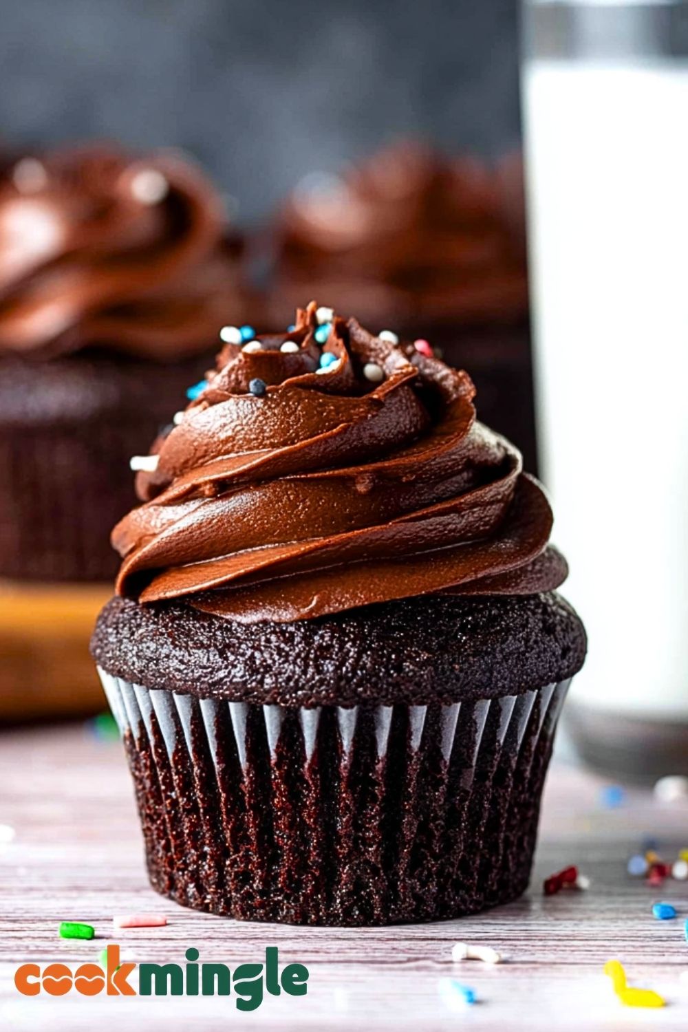 Once cooled, pipe a generous swirl of chocolate buttercream on each cupcake. Top with rainbow sprinkles or chocolate shavings for a fun finish. Serve immediately or refrigerate until ready to enjoy.
