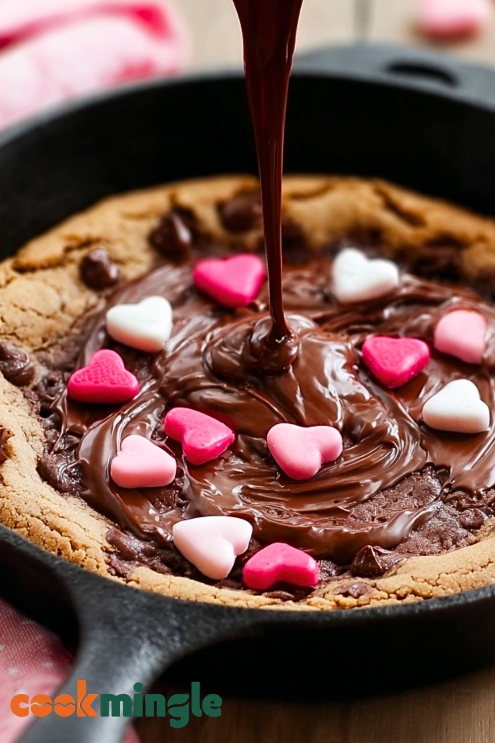 Let your butter soften at room temperature before starting; this helps blend the sugar and butter evenly for a creamy base. Don’t overmix the dough after adding the flour — just enough to combine. Use high-quality chocolate chunks or chips for best flavor, and if you want an extra fudgy center, press a few additional pieces of chocolate into the top before baking. Add the heart decorations after baking while the cookie is still warm, so they adhere without melting entirely. And finally, allow the skillet to cool for at least 10–15 minutes before serving — the cookie continues to cook in the hot pan and sets beautifully.