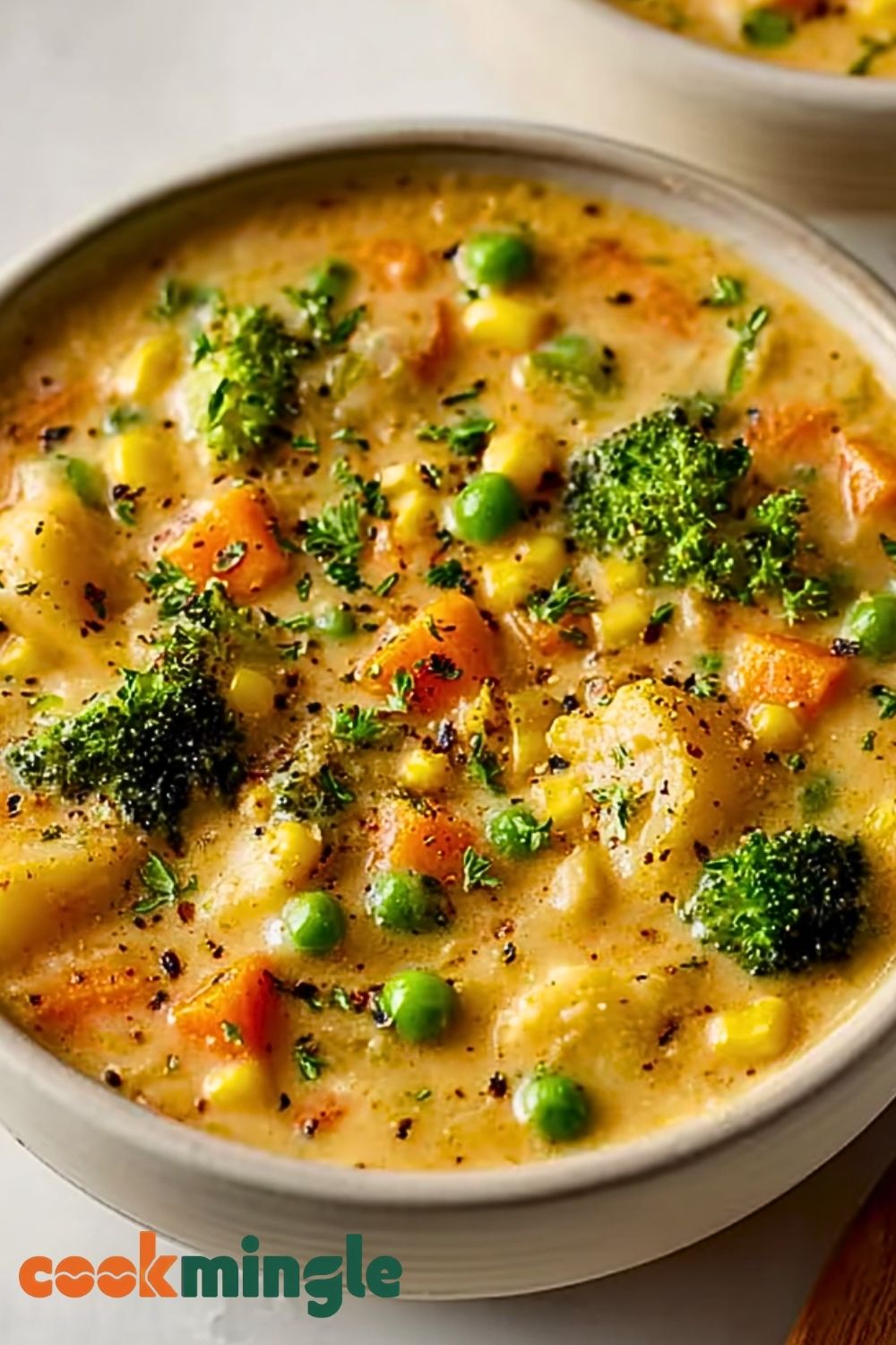 I created this soup recipe when I was craving that familiar pot pie flavor but didn’t want to mess with making crust. The result is thick and creamy, loaded with veggies like carrots, peas, corn, potatoes, and broccoli, and seasoned to perfection. Whether you’re looking for a meatless dinner option or just want a lighter spin on comfort food, this recipe truly hits the spot.