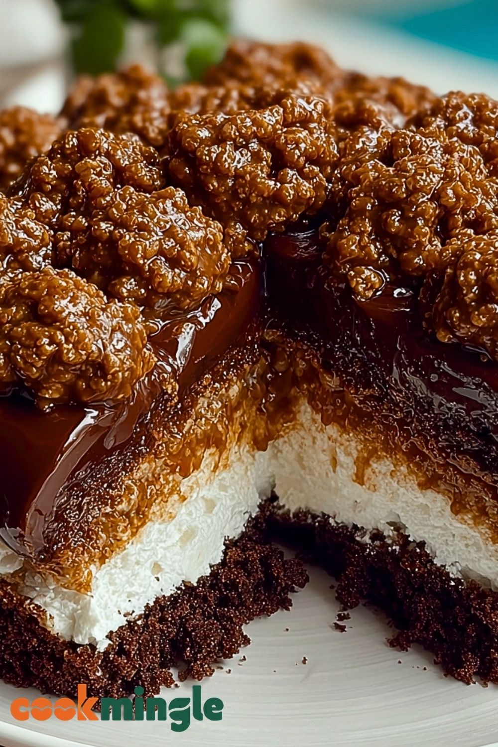 Place the finished cake in the fridge for at least 1 hour to let everything set. Once chilled, slice through all the layers and serve. Each bite should reveal all the textures: dense, fluffy, gooey, creamy, and crunchy.