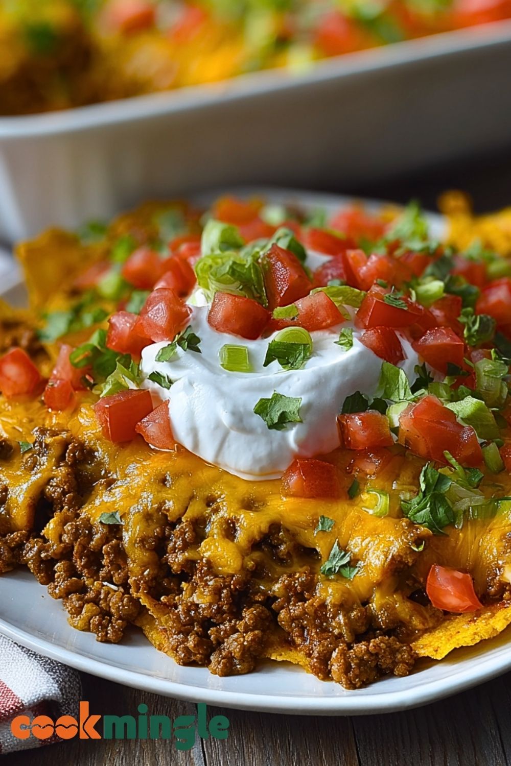 In a 9×13-inch baking dish, spread a generous layer of corn chips across the bottom. Spoon the seasoned beef mixture evenly over the chips. Sprinkle cheddar and Monterey Jack cheeses on top.