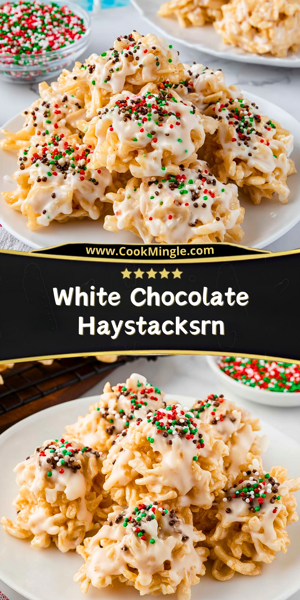 Crunchy, sweet, and festively sprinkled, White Chocolate Haystacksrn are the no-bake holiday treat you’ll want to make all season long. Made with crispy chow mein noodles, creamy white chocolate, and salty peanuts, these quick treats come together in minutes and are perfect for cookie swaps, holiday trays, or last-minute dessert ideas. Whether you’re looking for a fun food idea for kids, a simple snack, or an easy recipe to satisfy your sweet tooth, these bite-sized clusters are your go-to. Perfect for quick desserts, party snacks, or edible gifts.