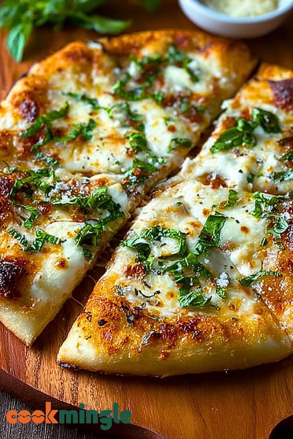 Prep Time: If you’re starting with ready-made dough, the prep takes around 15 minutes. This includes stretching the dough, preparing the garlic oil, and layering the cheese.