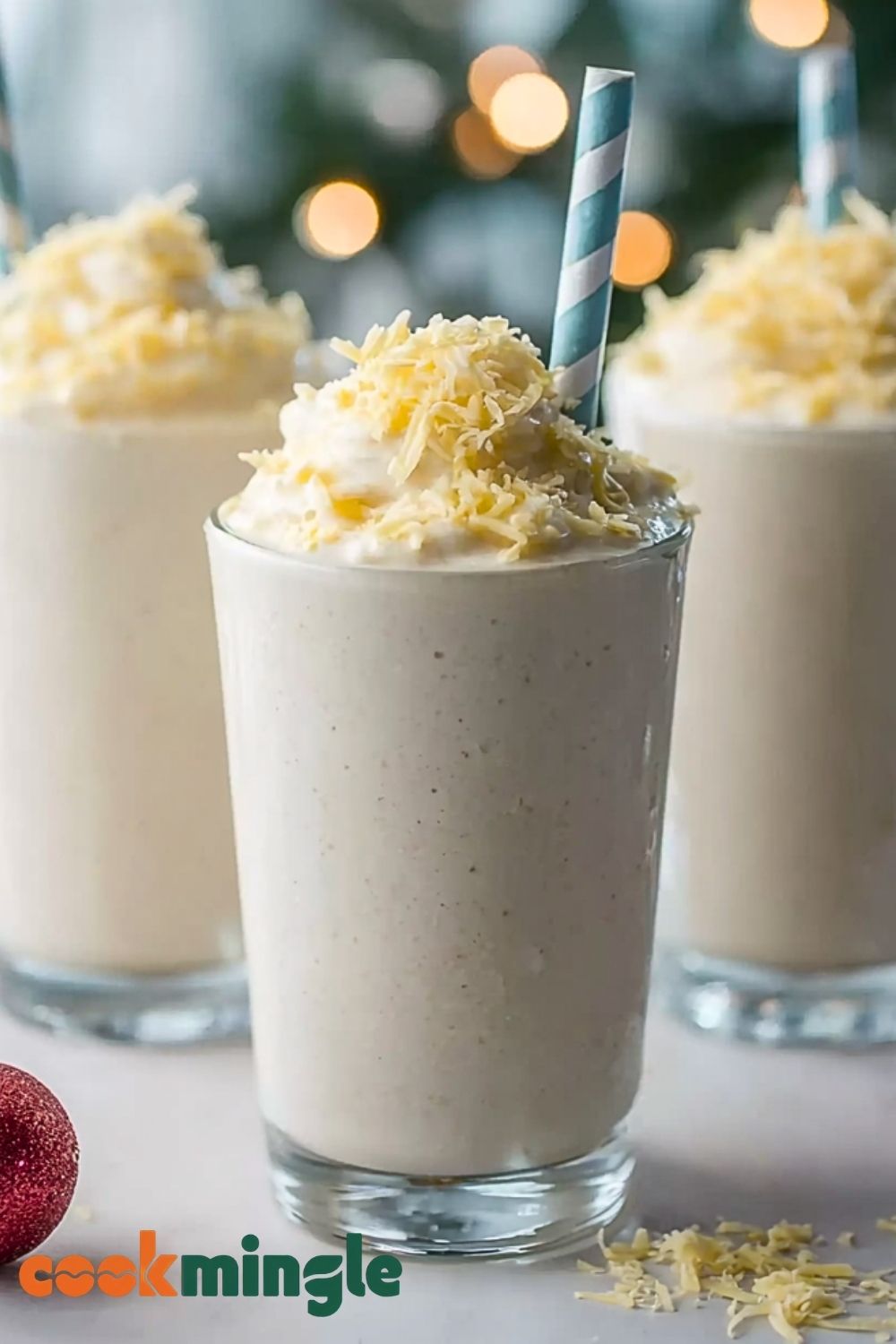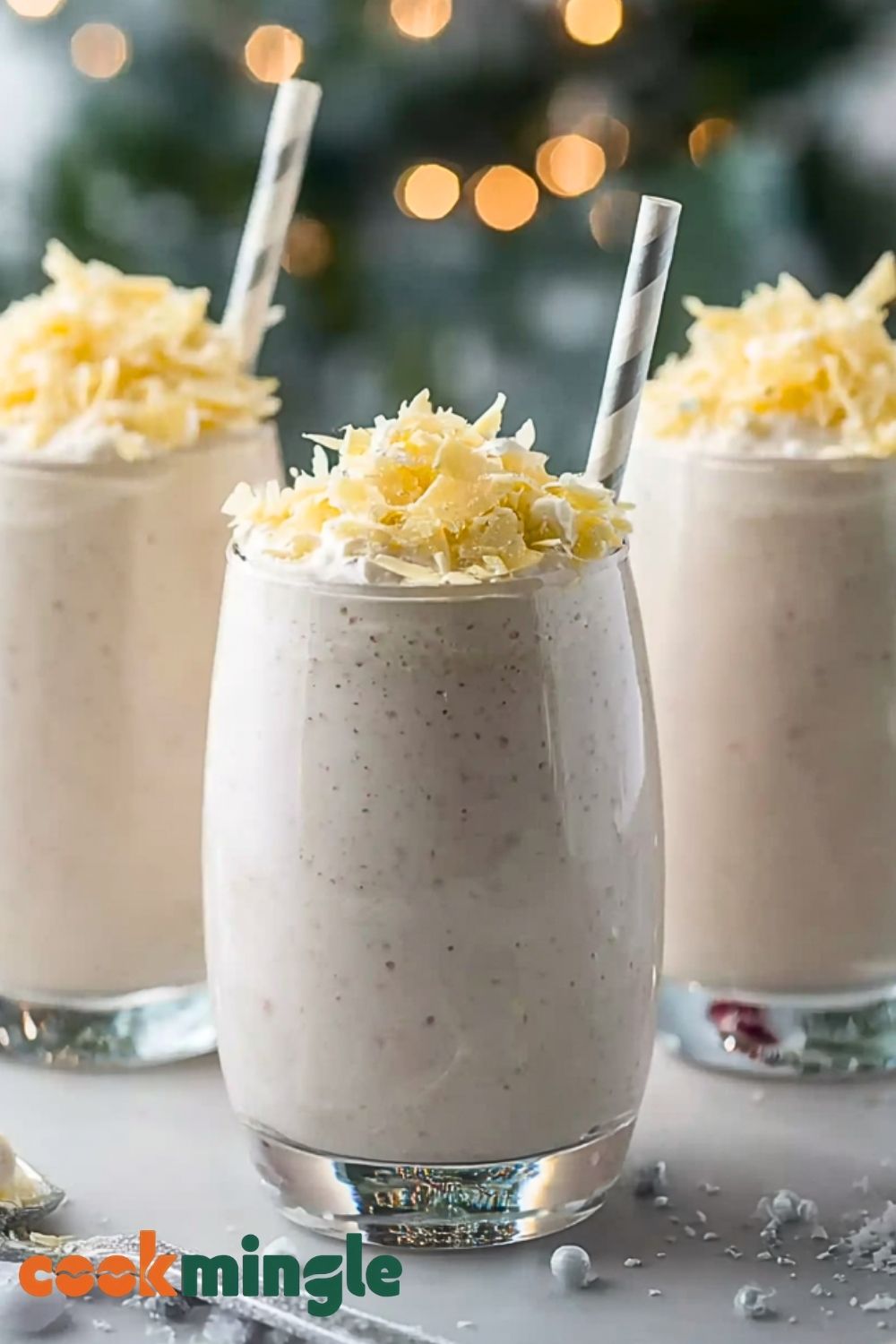 Pour the smoothie into chilled glasses. Top generously with whipped cream, then sprinkle white chocolate curls or shavings over the top for that magical snowy effect. Add a festive straw or drink stirrer for extra flair.